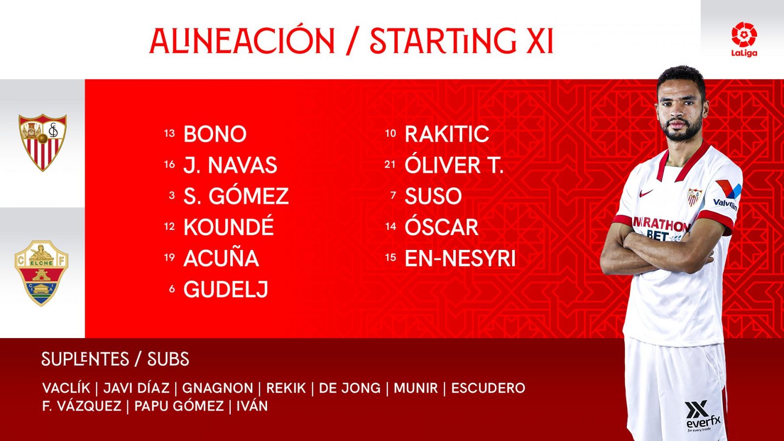 ĐỘI HÌNH RA SÂN trận Sevilla vs Elche, 01h00 ngày 18/03: VĐQG Tây Ban Nha