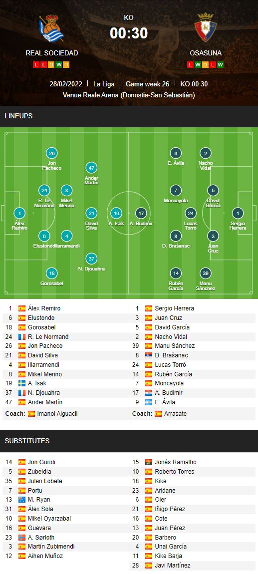 AEGoal cập nhật chính xác ĐỘI HÌNH RA SÂN trận Sociedad vs Osasuna diễn ra lúc 00h30 ngày 28/02 trong khuôn khổ giải VĐQG Tây Ban Nha.