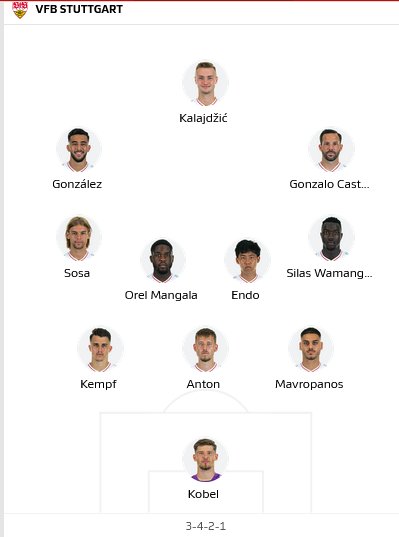 Stuttgart: Kobel - Mavropanos, Anton, Kempf - Silas, Mangala, Endo, Sosa - Castro (c), Gonzalez - Kalajdzic