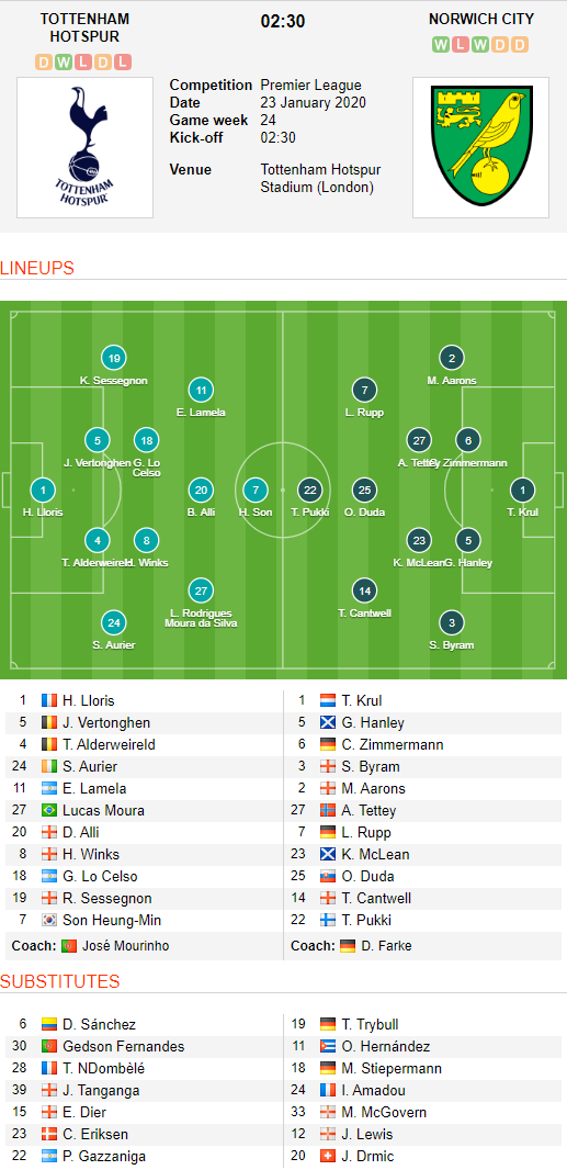 AEGoal.net cập nhật chính xác ĐỘI HÌNH RA SÂN trận Tottenham vs Norwich diễn ra lúc 02h30 ngày 23/1 trong khuôn khổ vòng 24 - giải Ngoại hạng Anh.