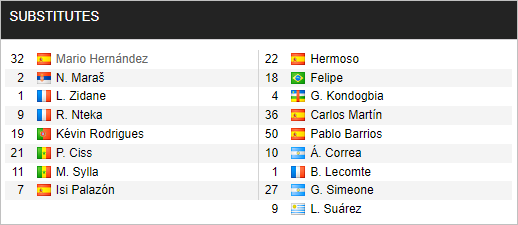 - Atletico Madrid: Carrasco, Matheus Cunha, Vrsaljko, Daniel Wass, Lemar chấn thương; Savic không sung sức.
