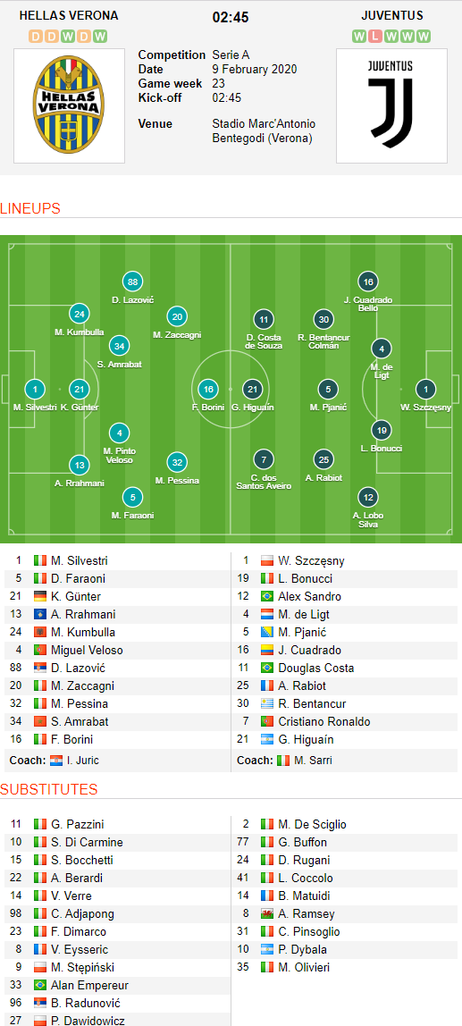 ĐỘI HÌNH RA SÂN trận Verona vs Juventus, 02h45 ngày 09/02: VĐQG Italia