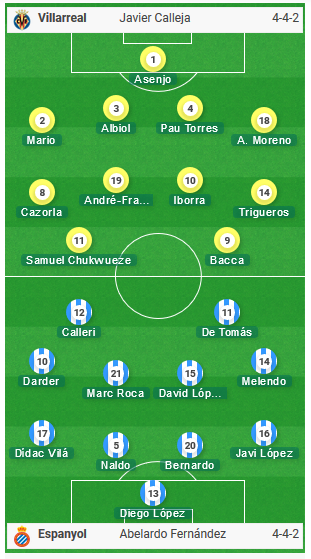 Villarreal: Asenjo; Mario Gaspor, Albiol, Pau y Alberto Moreno; Anguissa, Trigueros, Iborra y Cazorla; Chukwueze, Bacca.